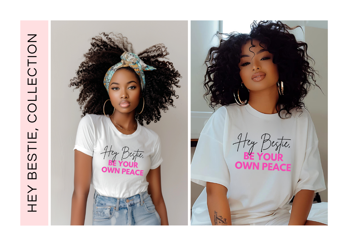 The Hey Bestie Collection offers empowering tees with positive affirmations celebrating strength, resilience, and sisterhood. Made from high-quality fabrics, they are perfect for various occasions, promoting positivity and community.